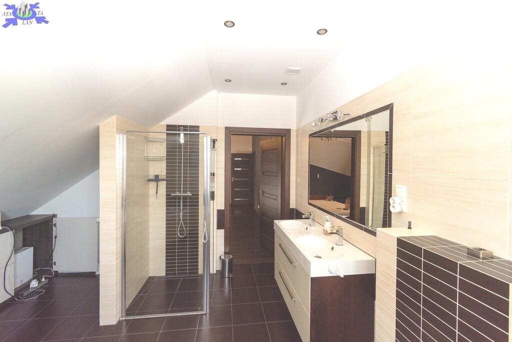 - łazienka z wanną i prysznicem oraz miejscem na pralkę i suszarkę