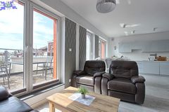 - Przestronny salon z otwartą kuchnią Stylowo urządzony salon z bezpośrednim wyjściem na duży balkon oraz otwartą kuchnią, wyposażoną w nowoczesny sprzęt AGD.