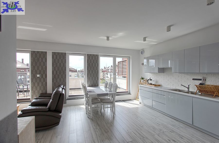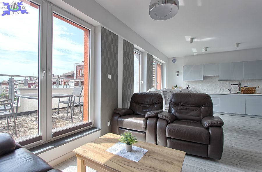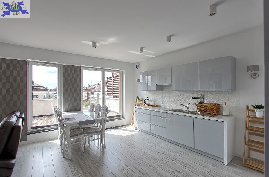 - Przestronny salon z otwartą kuchnią Stylowo urządzony salon z bezpośrednim wyjściem na duży balkon oraz otwartą kuchnią, wyposażoną w nowoczesny sprzęt AGD.