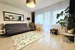 jasne i słoneczne, nowocześnie wykończone 2. pokojowe mieszkanie, usytuowane na 1. piętrze niskiego budynku z 1987 roku.