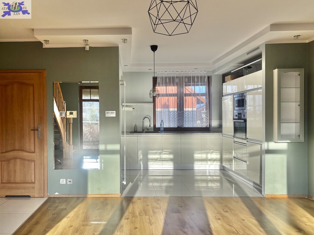 Na pierwszym poziomie jest otwarta, duża przestrzeń strefy dziennej z kuchnią oraz wyjściem na taras, łazienka.