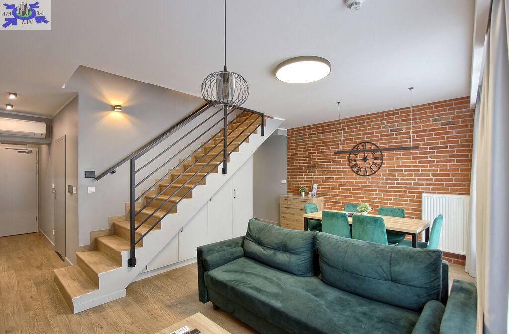 Mieszkanie 2 - poziomowe, z 2 sypialniami na drugim poziomie i częścią dzienną - salon z aneksem kuchennym na dole.