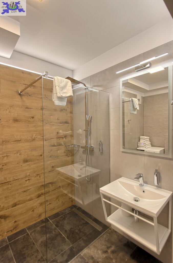 Szafy w zabudowie, telewizor, wyposażona kuchnia, pralka, kabina prysznicowa w łazience.