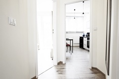 - Przedpokój ok. 8 m2 przy wejściu do mieszkania wnęka z szafą na wymiar, na podłodze panele, ściany gładzone pomalowane.