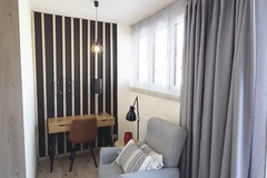 - Sypialnia ze słonecznym balkonem ok. 20 m2, uposażona w duże łóżko sypialniane, stoliki nocne z funkcją nawilżania powietrza, na lewej ścianie szafa w zabudowie służąca jako garderoba, na podłodze panele, ściany gładzone pomalowane.