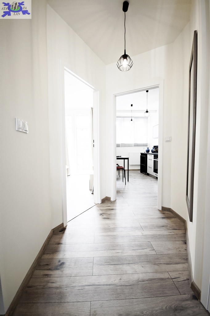 - Przedpokój ok. 8 m2 przy wejściu do mieszkania wnęka z szafą na wymiar, na podłodze panele, ściany gładzone pomalowane.