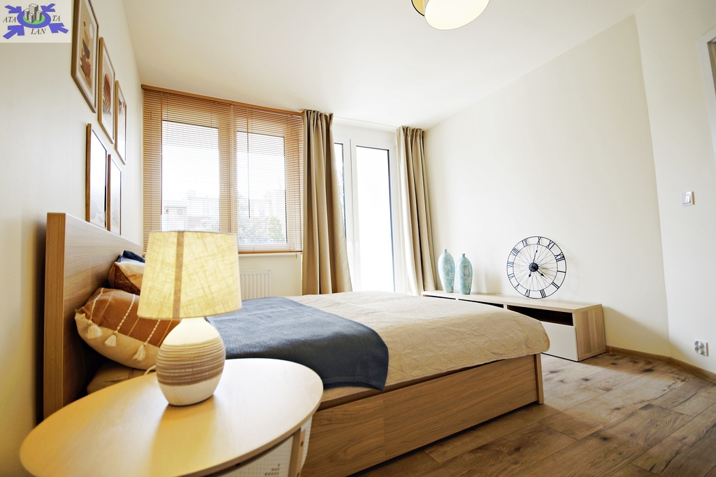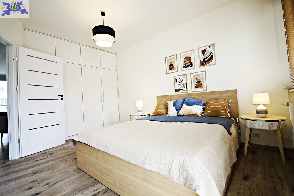 - Sypialnia ze słonecznym balkonem ok. 20 m2, uposażona w duże łóżko sypialniane, stoliki nocne z funkcją nawilżania powietrza, na lewej ścianie szafa w zabudowie służąca jako garderoba, na podłodze panele, ściany gładzone pomalowane.