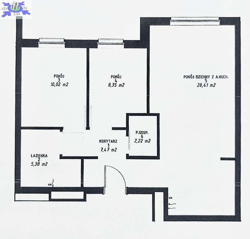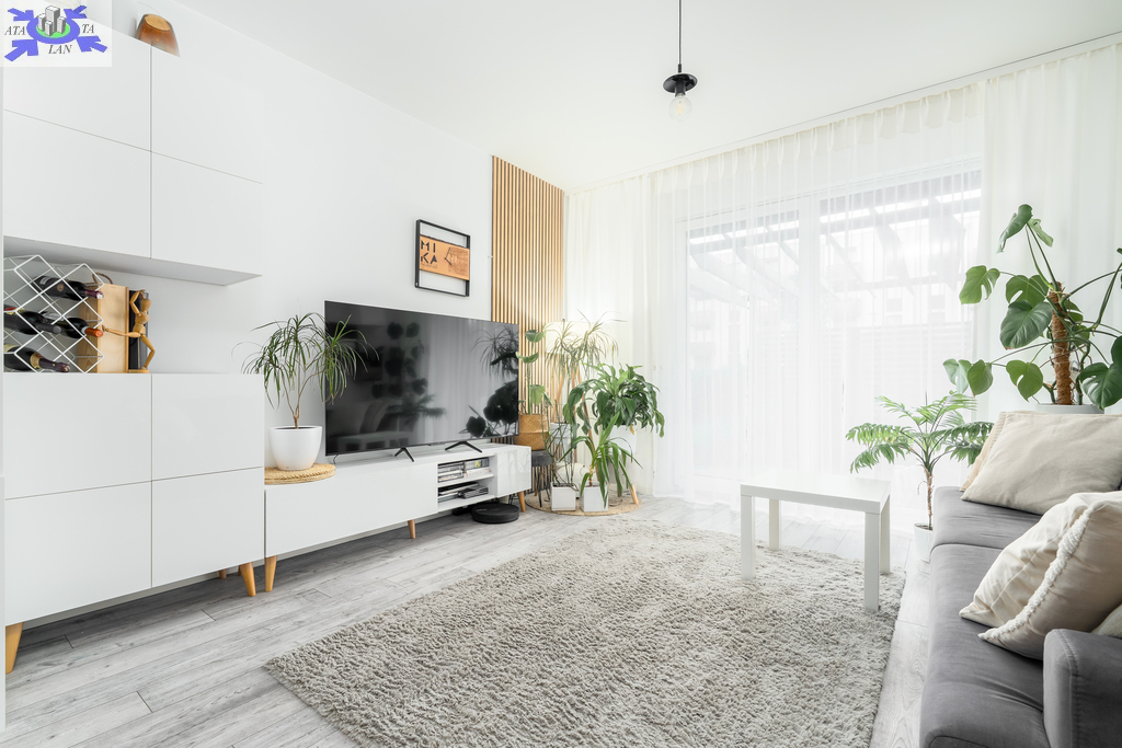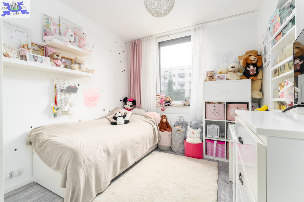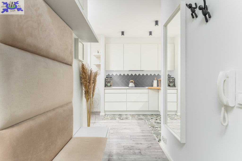 Mieszkanie posiada funkcjonalny układ obejmujący salon z aneksem kuchennym, dwie sypialnie, garderobę, przedpokój z pojemną szafą oraz łazienkę z ogrzewaniem podłogowym wodnym i prysznicem z funkcją wanny. Kuchnia została wykonana na wymiar i wyposażona w sprzęt AGD, a wszystkie zabudowy zaprojektowano indywidualnie.