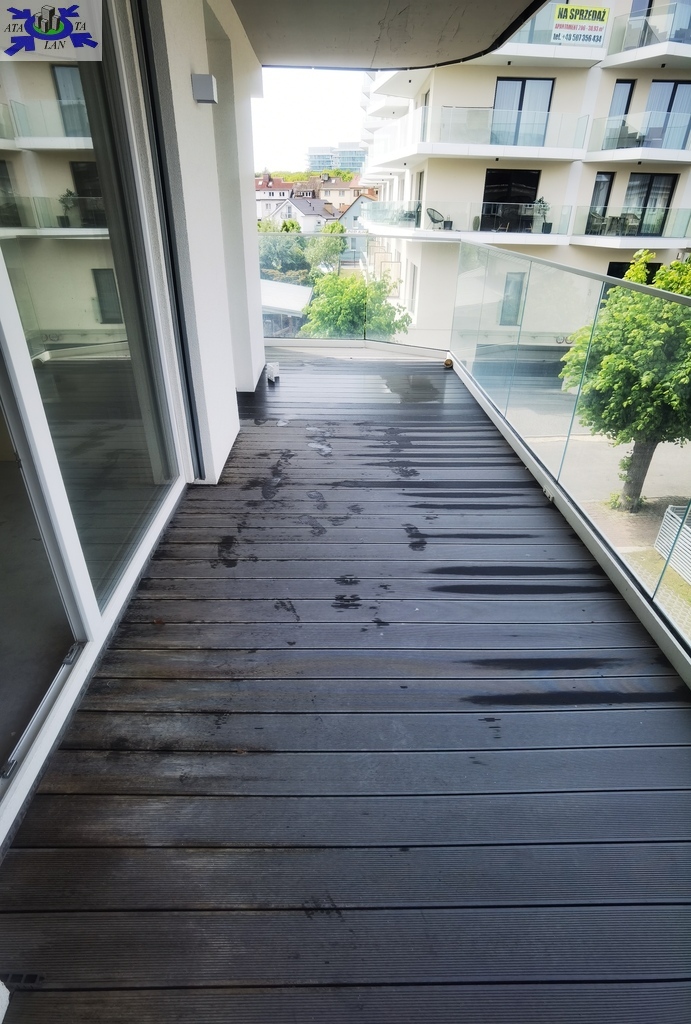 Przemyślany układ pomieszczeń, duży taras po całej długości apartamentu oraz duże przeszklenia zapewniają doskonałe doświetlenie wnętrz i poczucie przestrzeni.