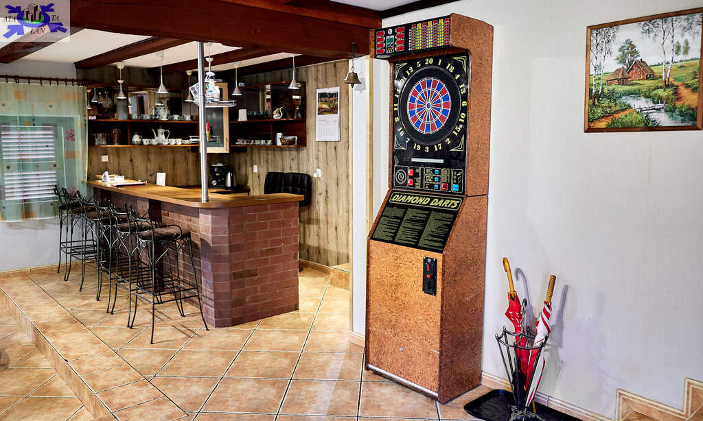 salon - pokój dzienny o pow. ok. 85 m2 wyposażony w niezbędne do wypoczynku mieszkańców i spędzania wspólnego czasu meble, automat do gry w darta (lotki) oraz klimatyczny kominek,