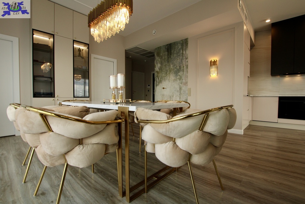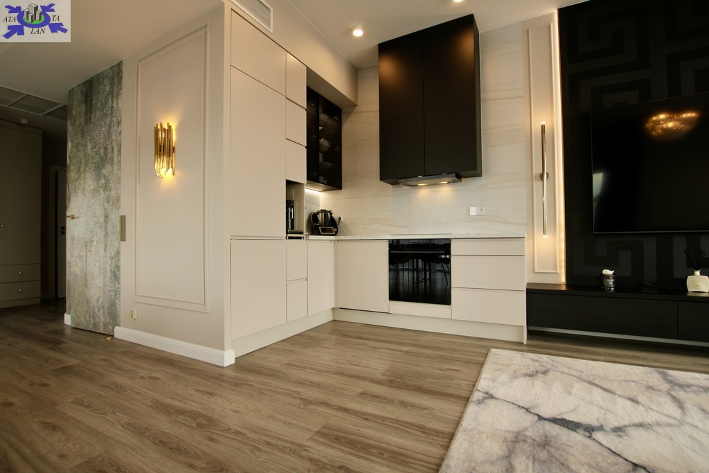 Wnętrze apartamentu zaprojektowano w stylu nowoczesny glamour z nutą art dco z najwyższej jakości materiałów - aksamitne tkaniny, złote wykończenia, naturalne drewno i designerskie oświetlenie oraz stylowe tapety tworzą wyjątkową całość. Każdy element ma tu swoje miejsce - nieprzypadkowy i dopracowany.