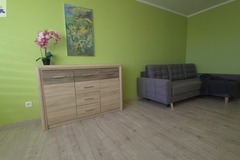 Salon wyposażony w rozkładaną kanapę, komodę oraz stół z 2 fotelami.