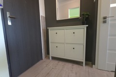 Korytarz z praktyczną szafką na buty i szafą na odzież.