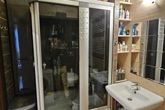 Łazienka wyposażona prysznic wolnostojący, umywalkę, wc i pralkę.