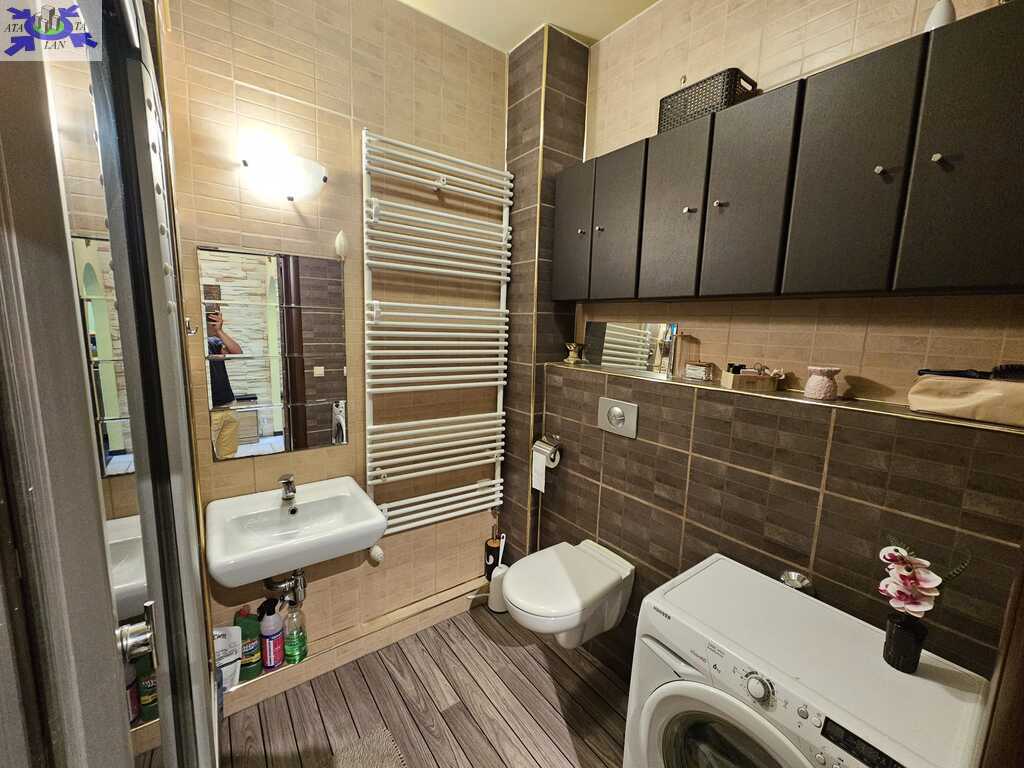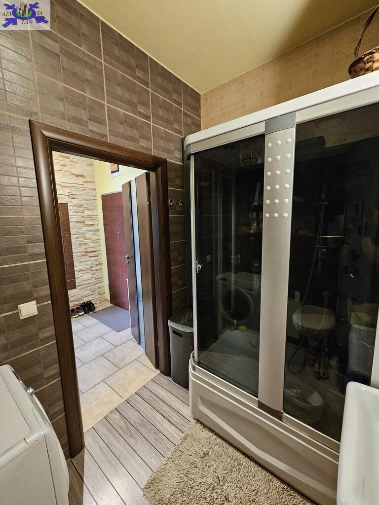 Łazienka wyposażona prysznic wolnostojący, umywalkę, wc i pralkę.