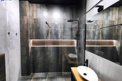 Łazienka w standardzie premium wielkoformatowe płyty o industrialnym charakterze, czarna armatura, prysznic typu walk-in oraz podświetlane wnęki nadają wnętrzu nowoczesny i minimalistyczny styl.