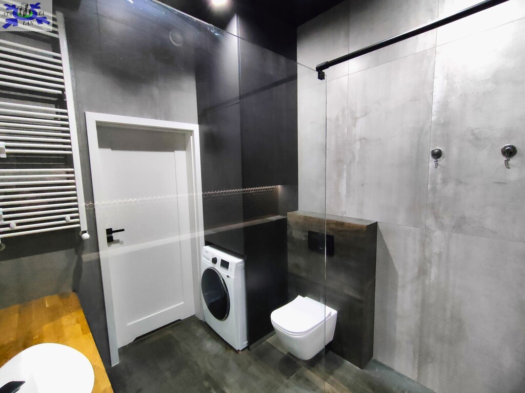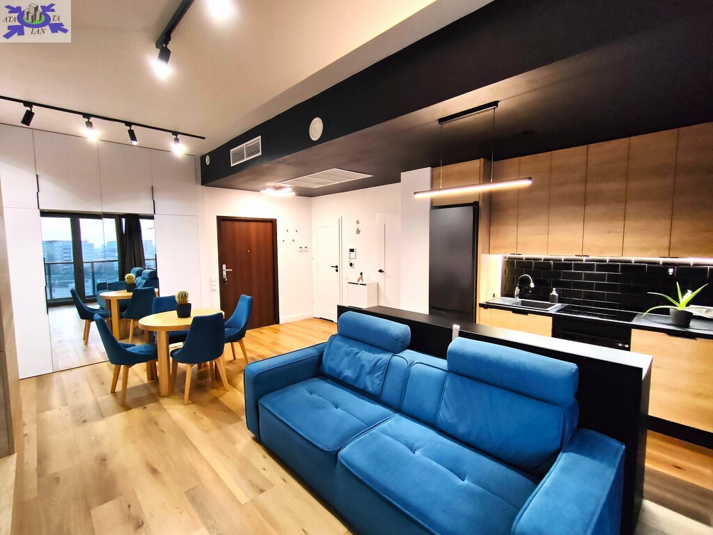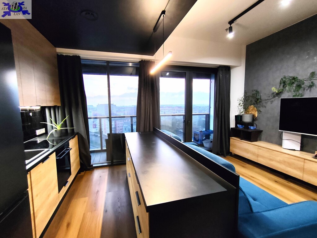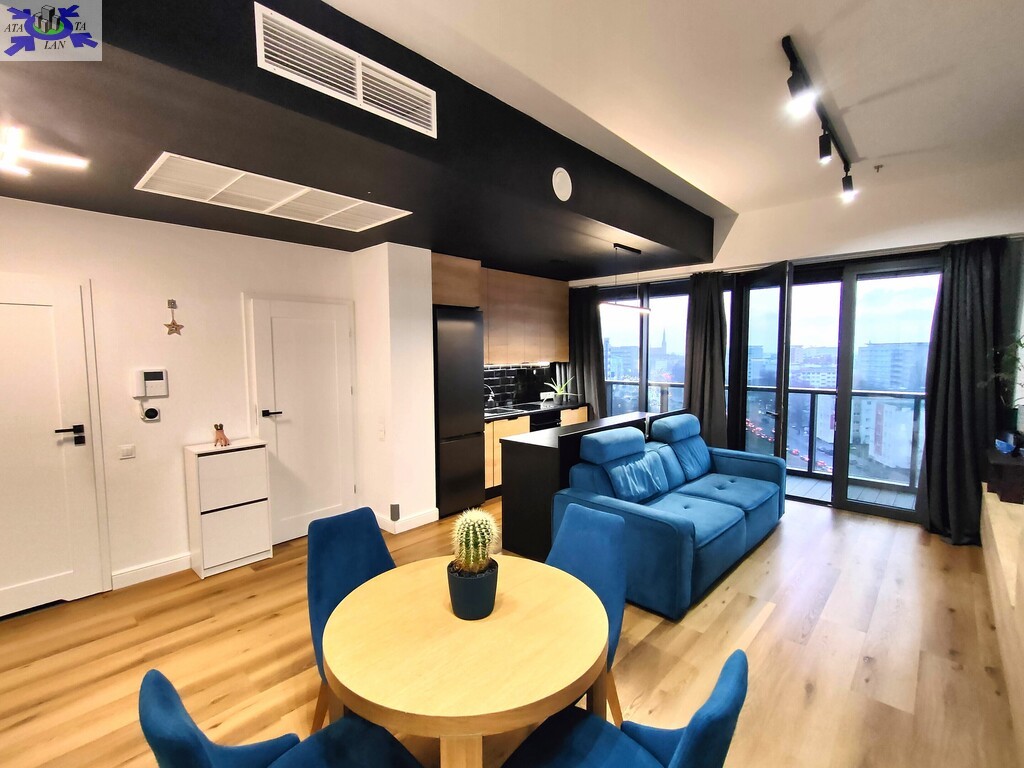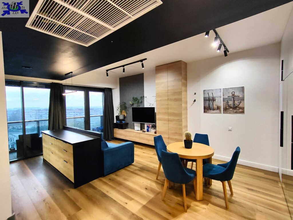 Apartament wykończony w nowoczesnym, spójnym stylu, z wykorzystaniem materiałów wysokiej jakości. Jasny salon połączony z aneksem kuchennym tworzy komfortową, dobrze doświetloną przestrzeń dzienną. Duże przeszklenia prowadzą na loggię i zapewniają atrakcyjny widok na centrum miasta.