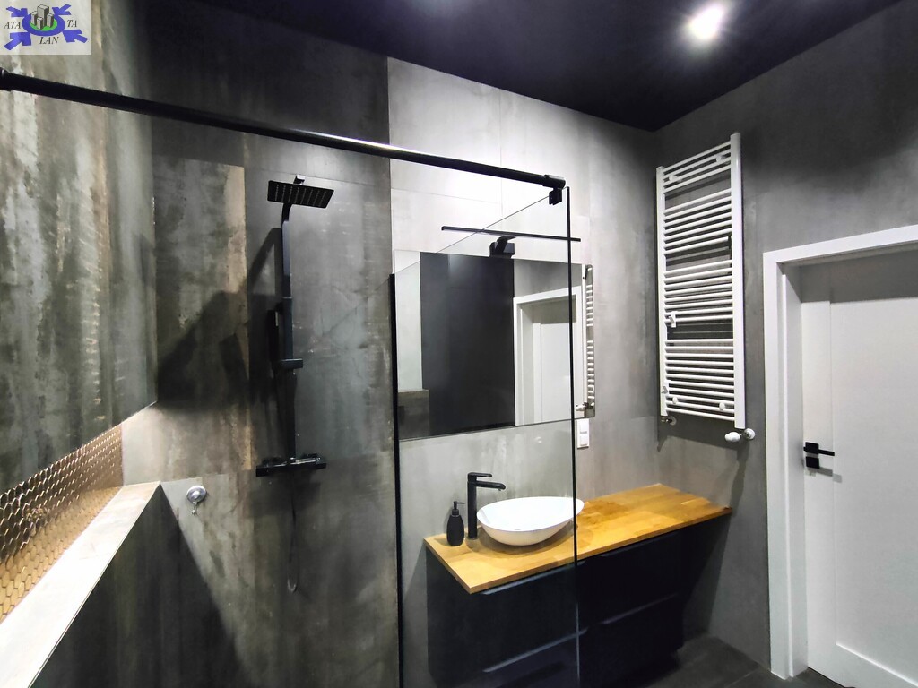 Łazienka w standardzie premium wielkoformatowe płyty o industrialnym charakterze, czarna armatura, prysznic typu walk-in oraz podświetlane wnęki nadają wnętrzu nowoczesny i minimalistyczny styl.