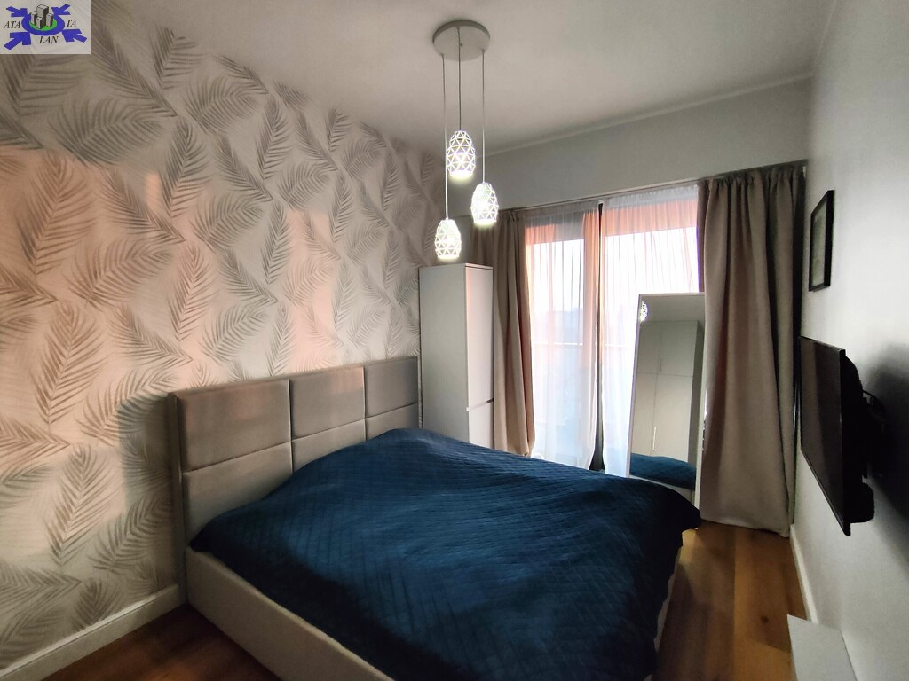 Kuchnia została wykonana z dbałością o funkcjonalność i estetykę drewniana zabudowa, czarne detale i dobrze rozplanowane oświetlenie tworzą elegancką całość. Sypialnia, oddzielona od salonu, zapewnia prywatność i również posiada wyjście na loggię, co optycznie powiększa przestrzeń.