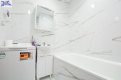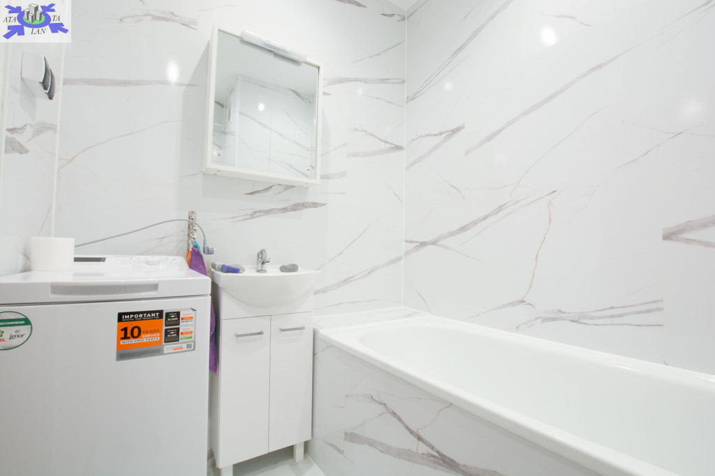 - ładnej łazienki po remoncie, z wanną, nową pralką, szafką z umywalką oraz wiszącą szafkę z lustrem.