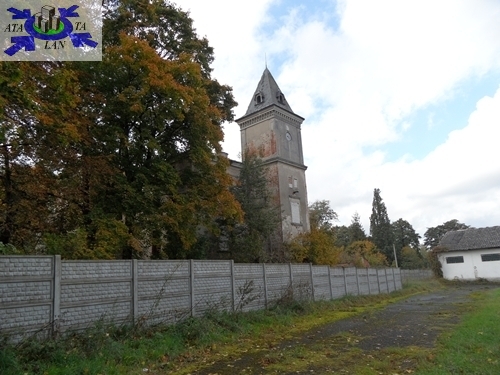 Działka ogrodzona siatką metalową , z wjazdem od wschodu- przez dziedziniec folwarczny.