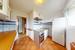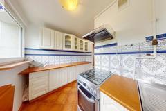 Kuchnia osobna, widna z meblami w zabudowie, wyposażona w kuchenkę oraz lodówkę.