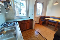 Niegdyś 3 pokojowa nieruchomość została przerobiona na 2 pokoje, trzecie wnętrze zostało połączone z kuchnią, dzięki czemu powstała funkcjonalna jadalnia.