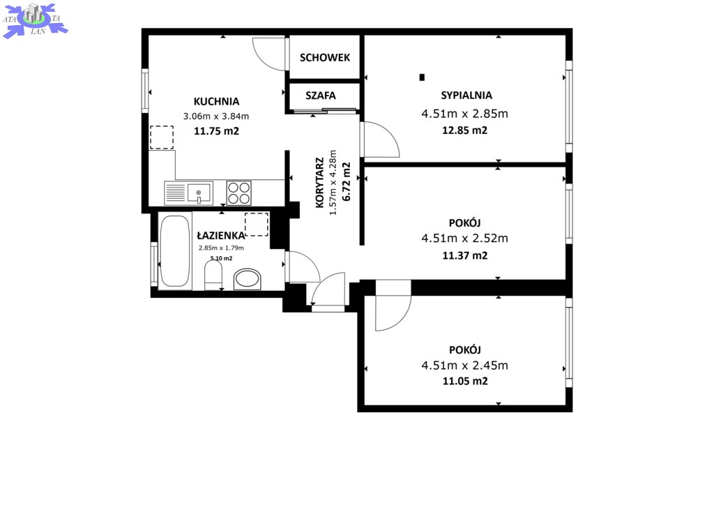 Mieszkanie ma powierzchnię 61,58 m2.
