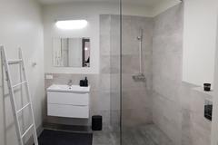 Łazienka nowocześnie zaaranżowana, w neutralnej kolorystyce - z kabiną prysznicową z odpływem liniowym oraz toaleta i umywalka.