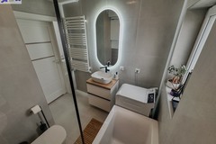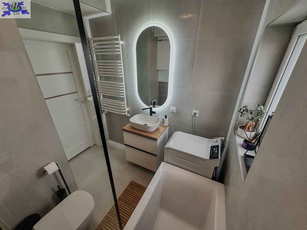 - Duża łazienka z wanną i oknem, eleganckim blatem oraz miejscem na pralkę