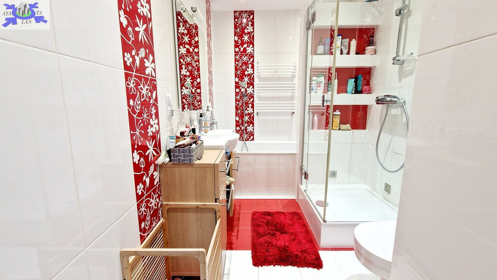łazienka na piętrze wyposażona zarówno w wannę, jak i prysznic,