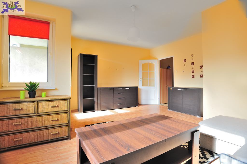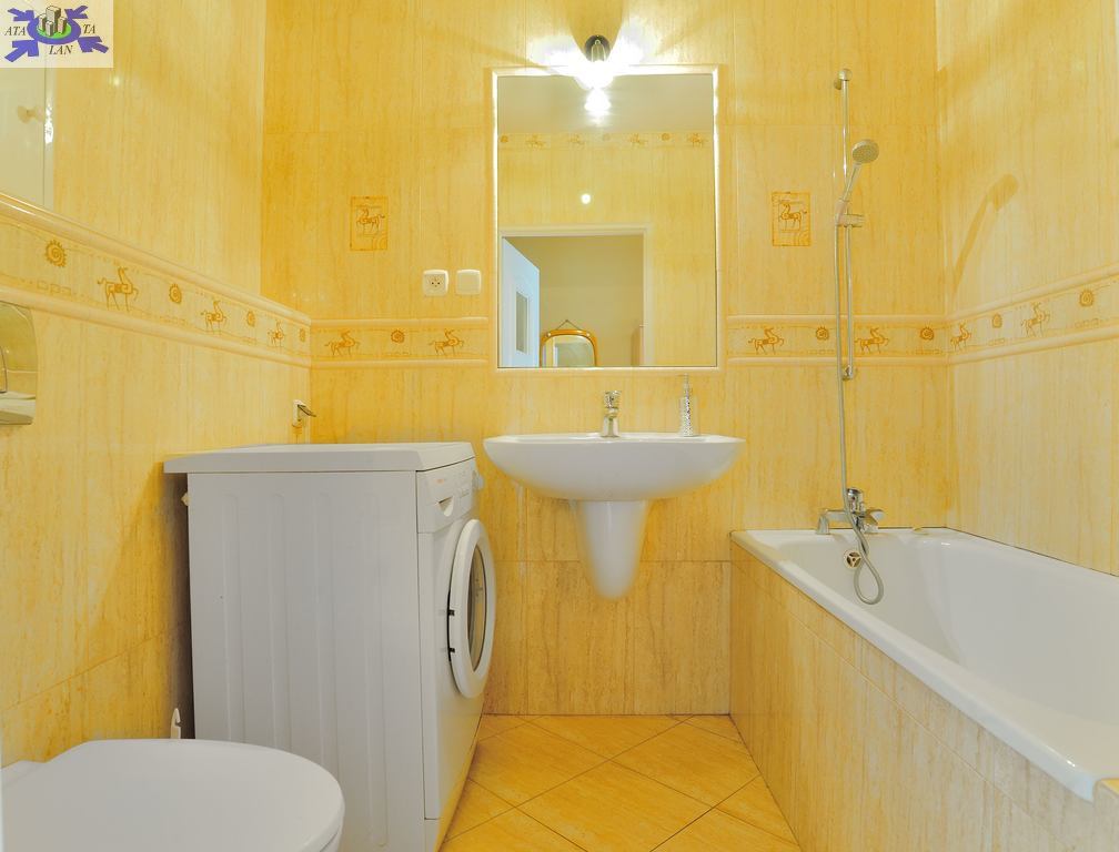 Łazienka wyposażona w wannę, umywalkę, wc i pralkę na ścianach glazura nowego typu. Pokój umeblowany w dwie komody, narożnik, fotel, ławę, szafkę oraz regał (widoczne na zdjęciach).