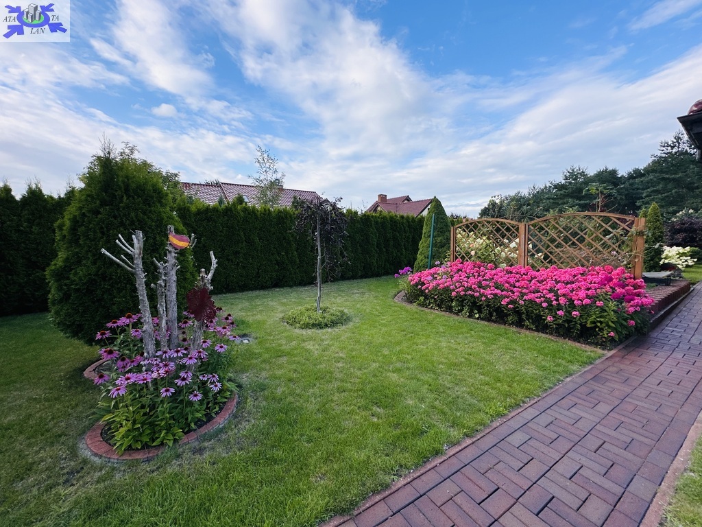 Pięknie zagospodarowany ogród o powierzchni 1400 m2 z oryginalną architekturą ogrodową pergolą, fontanną, drewnianą altaną z antresolą , tarasem rekreacyjnym.