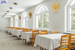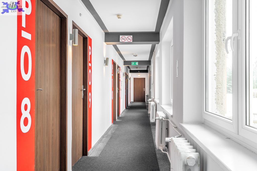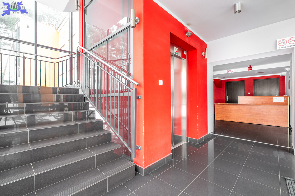Gruntowna modernizacja (2009 r.) Kompleksowy remont parteru budynku hotelowego oraz 15 pokoi wraz z łazienkami. Winda i dostępność W ramach rozbudowy dobudowano nowoczesne, przeszklone klatki schodowe. Jedna z nich została wyposażona w cichobieżną windę osobową, co czyni obiekt w pełni dostępnym dla osób niepełnosprawnych, seniorów oraz pacjentów wymagających opieki. Komfort zakwaterowania Pokoje hotelowe są jasne i przestronne, a większość z nich posiada prywatne balkony z widokiem na park, co jest kluczowym atutem przy długoterminowych pobytach (np. w domu seniora lub klinice rehabilitacyjnej).