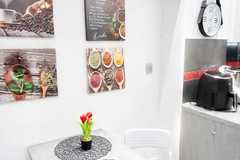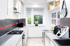 Kuchnia (ok. 10 m2) - wygodna, w pełni wyposażona, z meblami na wymiar i sprzętem AGD, z miejscem na stół