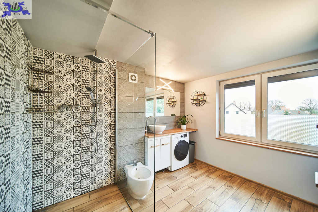 Drugi poziom oferuje kolejną, dużą sypialnię oraz drugą łazienkę, co zapewnia maksymalną wygodę mieszkańcom i idealnie sprawdza się w przypadku większej rodziny lub podczas wizyt gości. Dodatkowym atutem jest możliwość rozbudowy tej kondygnacji o przestrzeń strychową, co daje potencjał na stworzenie dodatkowego pokoju lub pracowni.