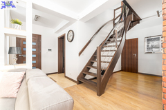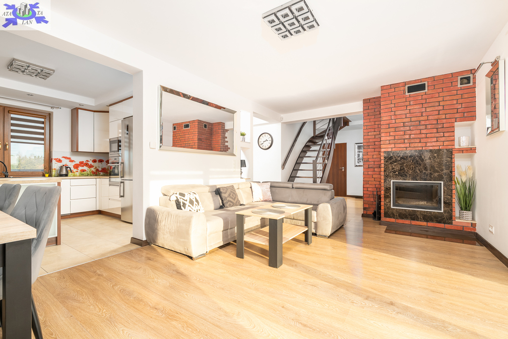 Kuchnia na wymiar Zaprojektowana pod indywidualne zamówienie, wyposażona w pełne, nowoczesne AGD. Panoramiczne przeszklenia Salon "wychodzi na zewnątrz", zapewniając doskonałe doświetlenie i poczucie przestrzeni. Kominek z DGP W salonie znajduje się kominek z systemem rozprowadzenia ciepła także na piętro - idealny na zimowe wieczory jako klimatyczny i alternatywny system grzewczy.Pełne umeblowanie, w przedsionku i sypialniach przemyślane zabudowy na wymiar, szafy i garderoba.Drewniane, ażurowe schody na piętro.
