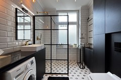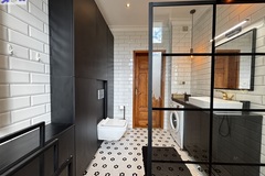 Łazienka połączona z toaletą. Wykończona gresem w i dodatkami w stylu francuskiej kamienicy.