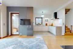 Wnętrza wykończone z wysokiej jakości materiałów, na podłogach deska dąb Walczak oraz włoskie gresy Atlas Concorde.