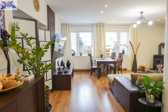 * salon 37 m2, otwarty na hall, pięknie doświetlony, z miejscem na wypoczynek i jadalnię, widok na ogród, wyjście na balkon i stamtąd kilkoma schodami do ogrodu, kominek z płaszczem wodnym uprzyjemni zimowe wieczory, ciepło rozprowadzane jest w całym domu.