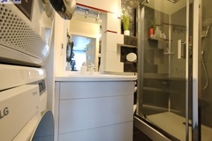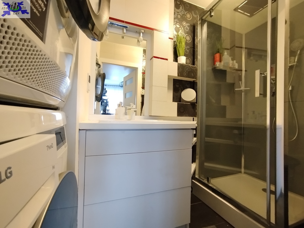 * łazienka z kabiną prysznicową, pralką i suszarką,