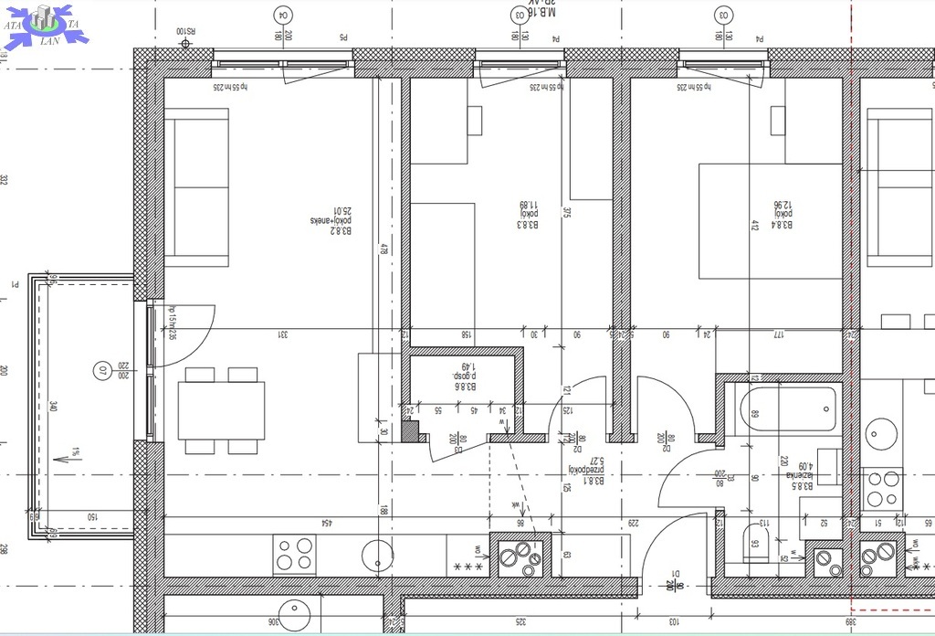 salon z aneksem kuchennym o pow. 25m2sypialnia o pow. 11,89m2sypialnia o pow. 12,96m2 łazienka razem z WC o pow. 4m2 pomieszczenie gospodarcze o pow. 1,5m2 korytarz