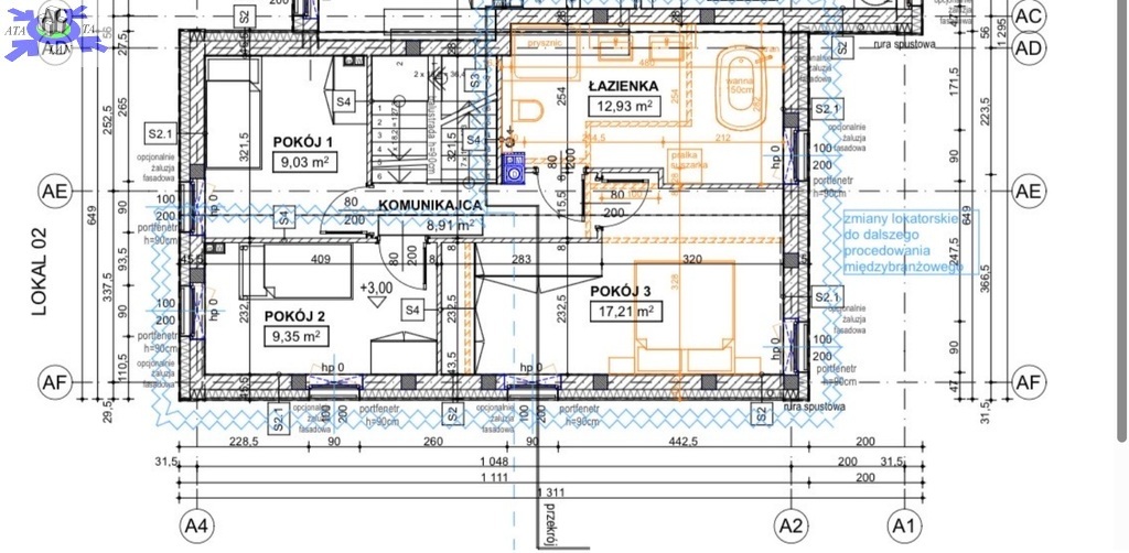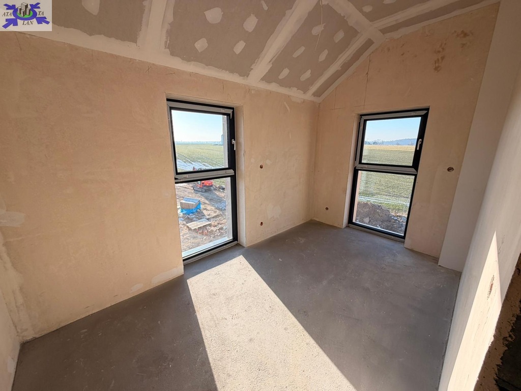 Powierzchnia domu ok. 112,53 m2 (salon z aneksem + 3 sypialnie, 2 łazienki).