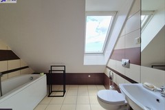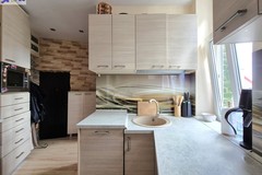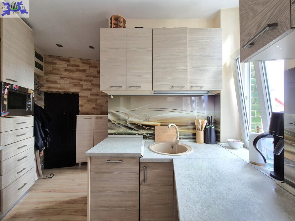* dolny poziom przedpokój przechodzący w widną kuchnię w zabudowie z AGD, łazienka z prysznicem, umywalką, wc i pralką, pokój dzienny z wygodnym narożnikiem i komodami oraz odsłoniętą czerwoną cegłą, sypialnia z dużym łóżkiem, rozkładaną sofą i szafą na wymiar, balkon od strony cichego podwórza