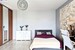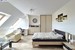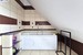 * górny poziom sypialnia z łóżkiem małżeńskim i szafą na wymiar, schowek, a także łazienka z wanną, umywalką i wc