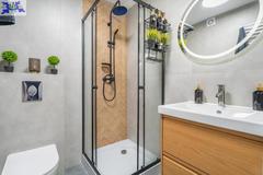 Łazienka wykończona została w nowoczesnym stylu - z kabiną prysznicową, czarną armaturą i drewnianymi akcentami.
