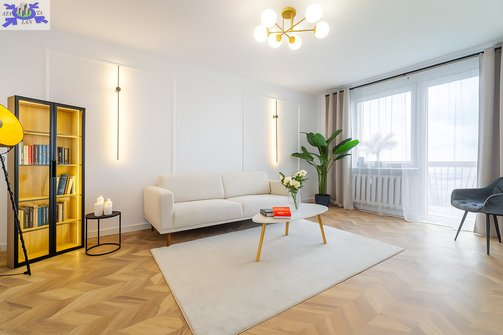 Przestronny salon z dużym oknem i wyjściem na balkon to idealne miejsce do wypoczynku i spotkań z rodziną. Jasne ściany, dębowa podłoga w jodełkę oraz nowoczesne oświetlenie tworzą przytulny, harmonijny klimat.