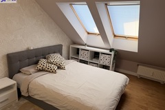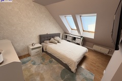 Na drugi poziom składają się dwie sypialnie, duża łazienka z wanną oraz obszerny korytarz z miejscem na zabudowaną szafę.