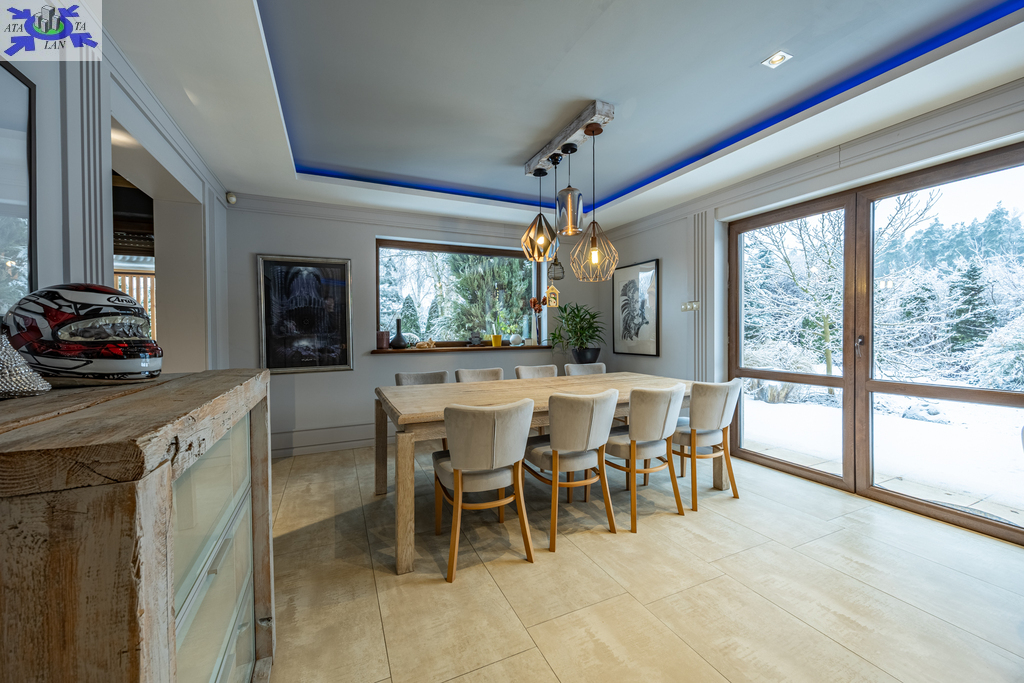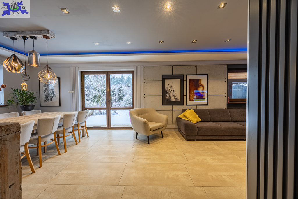 - duży salon, z częścią jadalną, kominkiem i z wyjściem na taras i ogród