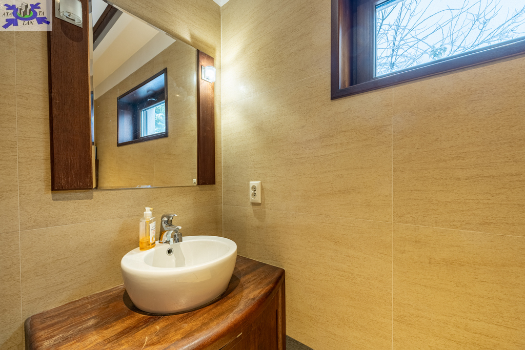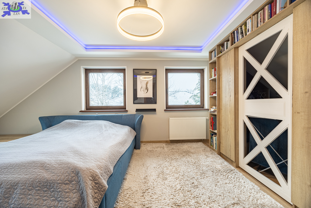 Działka bardzo ładnie zagospodarowana, z licznymi nasadzeniami, systemem nawadniania oraz dużym zadaszonym tarasem. Na działce znajduje się także drugi garaż o powierzchni ok. 35 m2 z lekkiej konstrukcji, nieogrzewany.